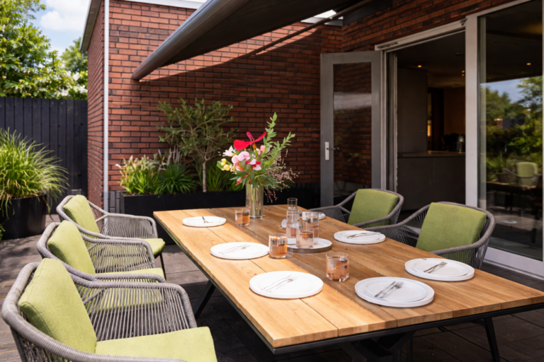 Terrasschermen, ook wel knikarmschermen genoemd, zijn een praktische oplossing om schaduw te creëren boven uw terras. Doordat het scherm naar voren uitvalt met armen, blijft de ruimte onder het scherm vrij. Dat maakt terrasschermen ideaal voor terrassen waar u comfortabel wilt zitten zonder in te leveren op bewegingsvrijheid.